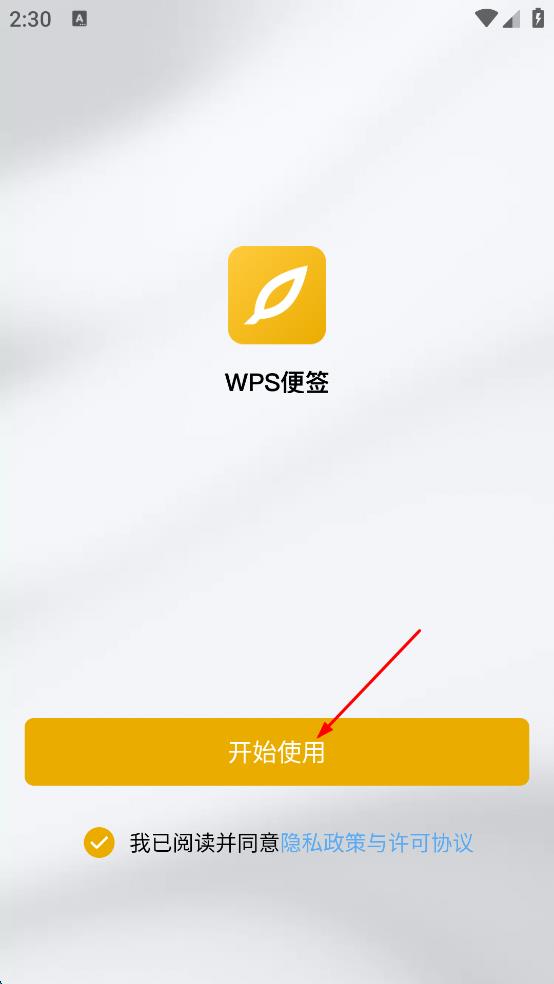 1、打开WPS便签,勾选“我已阅读并同意隐私政策与许可协议”,点击“开始使用”按钮。