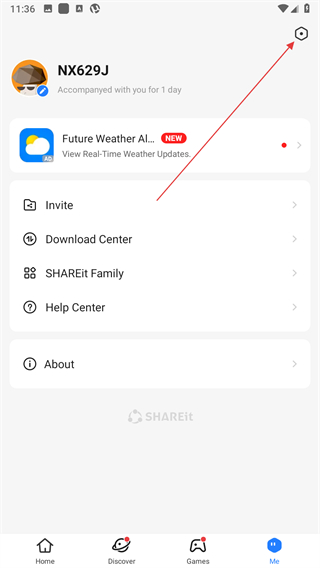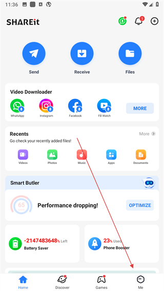 1、打开茄子快传主界面,点击底部导航栏最右侧的Me选项,进入个人中心页面。