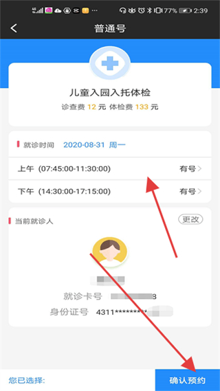 2、在挂号页面选择就诊项目,再选择就诊时段,确认就诊人信息,点击确认预约。