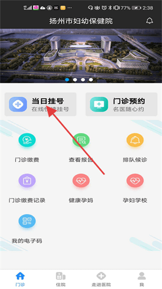 1、打开扬州妇幼保健院app的门诊页面,点击当日挂号。