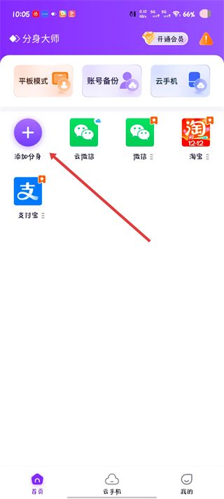 1、打开分身大师APP进入首页,点击页面左上方的添加分身按钮,进入应用选择界面。