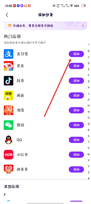 2、在添加分身界面的热门应用列表里找到目标应用,点击对应应用右侧的添加按钮。