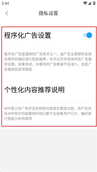 4、在隐私设置页面查看程序化广告设置及个性化内容推荐说明,可按需操作。