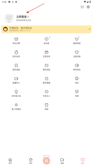 1、在猫耳FM主界面底部,点击右侧我的选项,进入个人中心页面。