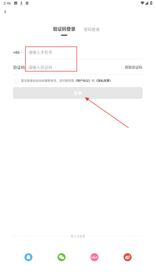 3、输入手机号、验证码后,勾选协议并点击登录,完成账号登录。