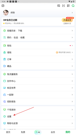 2、在我的页面中,找到并点击设置的功能选项,进入设置页面。