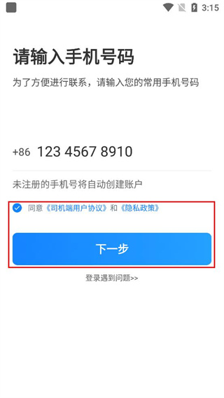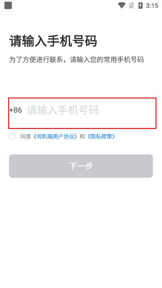 3、勾选同意司机端用户协议和隐私政策的选项,点击下一步按钮推进注册流程。