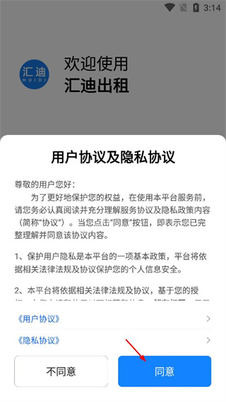 1、打开汇迪出租应用,查看用户协议及隐私协议内容,点击同意按钮进入后续页面。