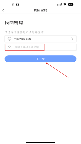 2、在找回密码的页面内,输入手机号后点击下一步的按钮。
