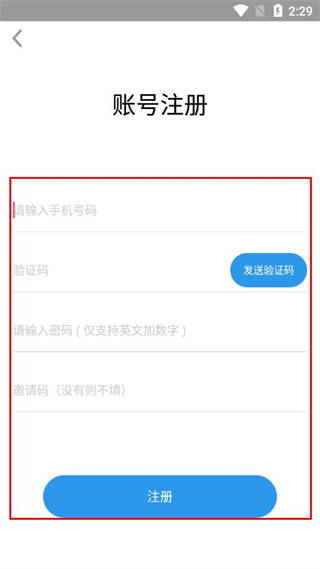 3、填写手机号码、验证码、设置仅包含英文和数字的密码,若有邀请码可填写,点击注册。