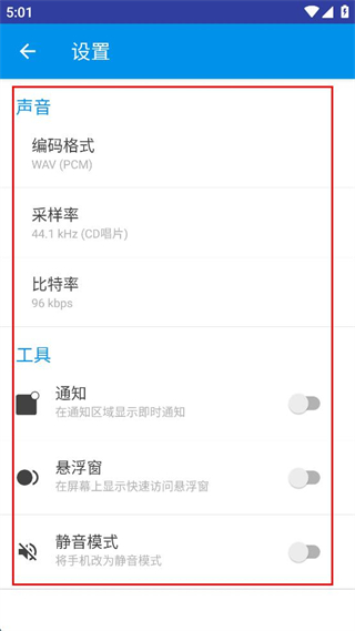4、在高级设置页面,可查看编码格式采样率等声音设置,以及各类工具选项。