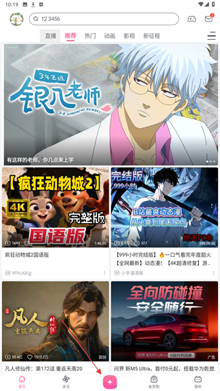 1、启动哔哩哔哩的APP,进入首页点击下方+的图标。