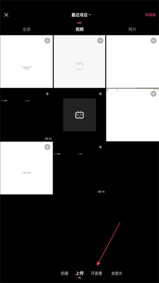 2、进入视频选择的界面内,点击下方开直播的功能按钮。