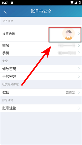 4、在账号与安全页点击设置头像,完成头像图片的设置操作。