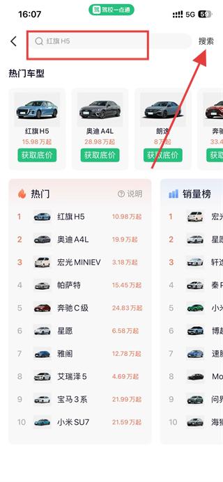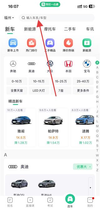 2、在选车页面,点击上方搜索框,进入搜索页面。