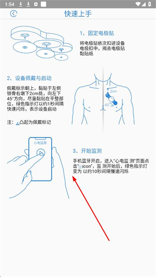 3、依次完成固定电极贴、设备佩戴与启动,蓝牙开启,进入心电监测页面点开始监测。