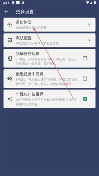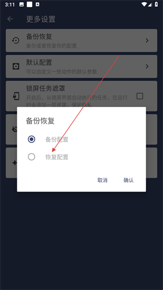 3、在更多设置界面里,找到备份恢复并点击,弹出恢复配置的弹窗。