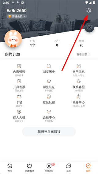 1、打开途家app,点击底部导航栏最右侧我的选项,点击右上角设置图标进入设置界面。