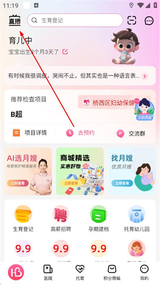 1、打开孕健康,在主页面点击左上角的直播入口。