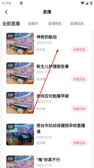 3、在直播回放列表中找到目标直播,点击观看回放即可查看。