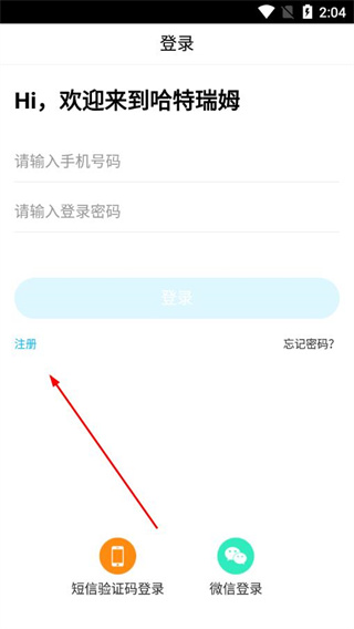 1、打开哈特瑞姆app的登录页面,点击注册选项,进入注册新用户页面。