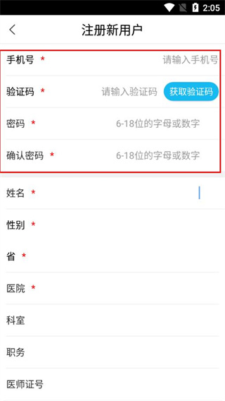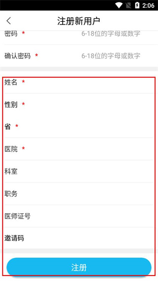 3、填写姓名、性别、所在省、医院等必填信息,按需补充科室、职务等内容后,点击注册。