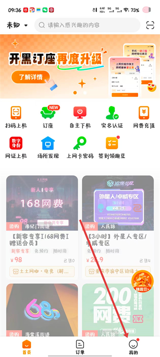 2、进入APP主界面,在页面中找到显示新人专享168网费的团购推荐内容,点击该内容。