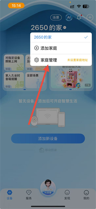 1、在应用app首页,点击上方的家庭名称区域,弹出操作菜单后找到家庭管理选项并点击,进入对应管理界面。