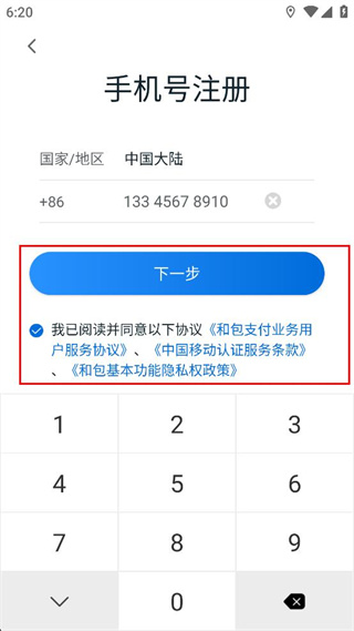4、勾选已阅读并同意相关协议的选项,确认信息填写完整后点击下一步按钮继续注册。