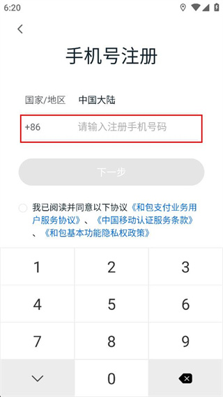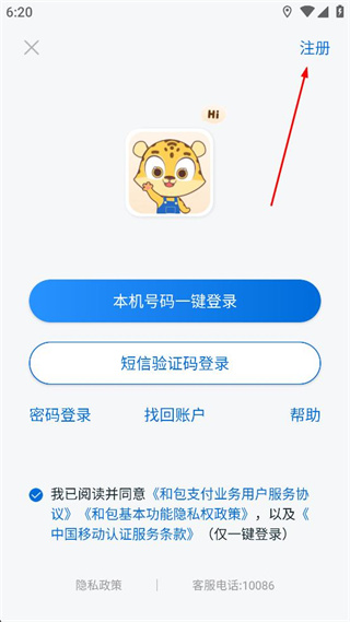 2、进入和包的登录界面,找到页面右上角的注册选项,点击该选项进入手机号注册页面。