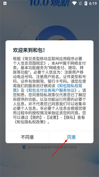 1、打开和包软件,看到欢迎来到和包的弹窗,点击弹窗里的同意按钮,完成协议确认。
