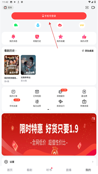 2、进入我的界面内,点击上方手机号登录的按钮。