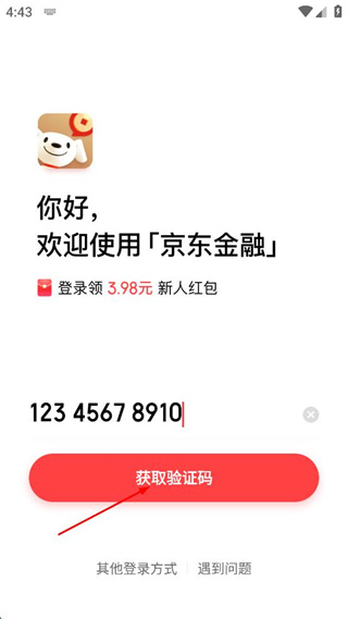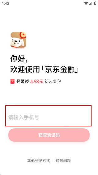 1、在京东金融登录页面的输入框内填写手机号码,填写完成后点击获取验证码按钮。