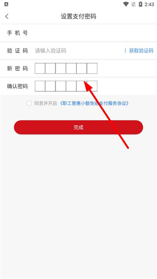 5、在页面输入手机号、获取验证码,设置新密码,勾选协议后点击完成即可。