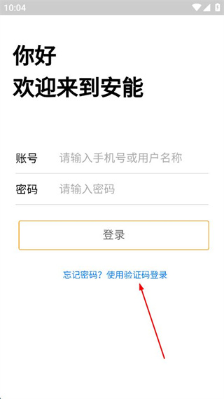 1、在安能的欢迎登录界面,点击“使用验证码登录”选项,切换到验证码登录页面。