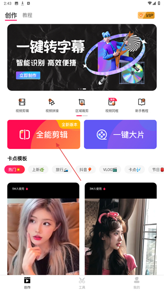 1、启动爱剪辑App,在创作页面内点击全能剪辑按钮。