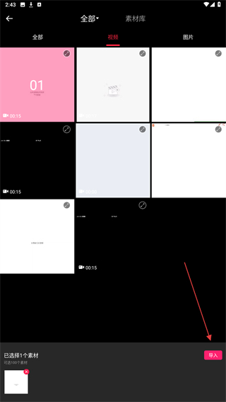 2、在素材选择界面中,选中目标视频素材,点击右下角的导入按钮。