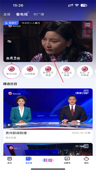 3、进入看电视页面后,可看到贵州卫视等电视频道选项,点击贵州卫视,即可观看该频道直播内容。