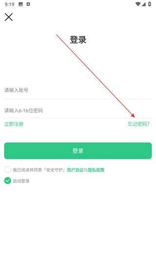 2、在账号登录界面中,找到并点击忘记密码,跳转至忘记密码的验证页面。