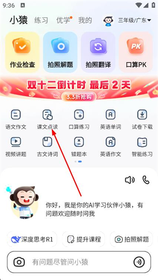 1、打开小猿搜题APP,在首页找到课文点读选项并点击。
