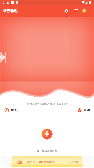 1、打开录音助理应用,点击界面右上角齿轮形状的设置图标,进入设置页面。