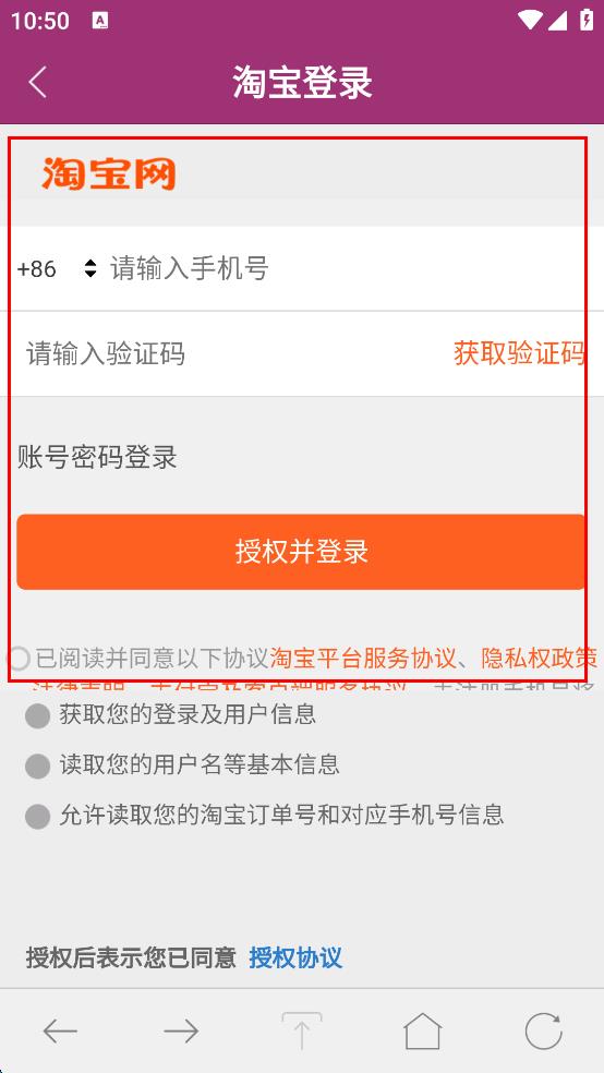 3、进入淘宝登录页面,输入手机号和验证码,勾选协议后点击授权并登录。