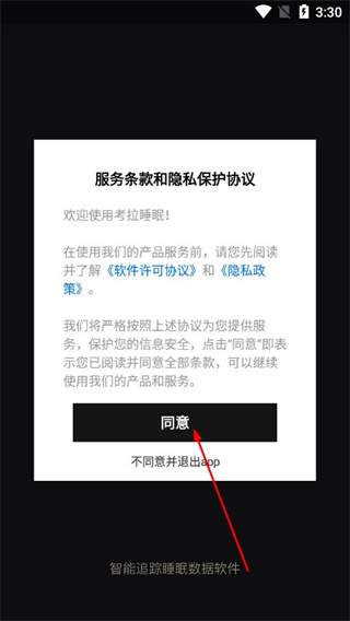 1、打开考拉睡眠app,在弹出的服务条款和隐私保护协议”弹窗中点击同意。