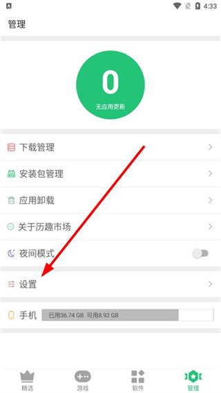 2、在管理页面中,找到设置选项并点击,进入设置界面以调整应用相关配置。