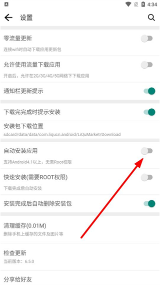 3、在设置界面里,找到自动安装应用选项,点击其对应的开关按钮即可开启自动安装程序功能。