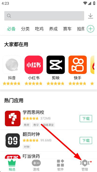 1、进入应用界面后,找到底部导航栏的管理选项并点击,进入对应功能页面以进行后续操作。