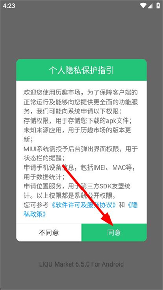 1、打开历趣市场,在弹出的窗口中点击同意按钮。