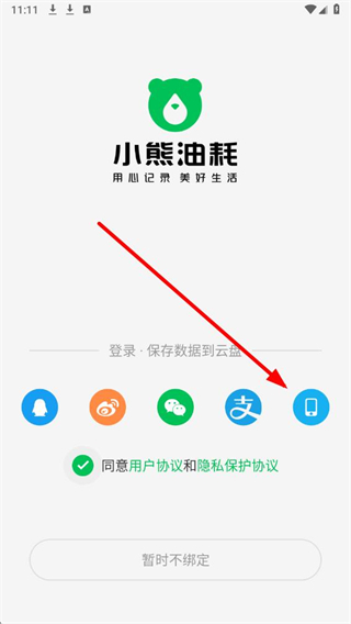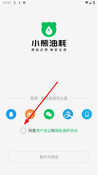 1、点击小熊油耗app,在登录界面,点击勾选用户协议的勾选框。