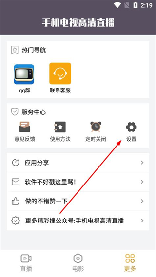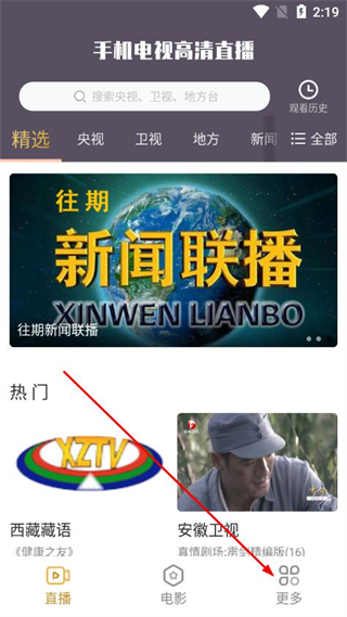 1、在手机电视高清直播首页,点击底部更多选项,进入更多功能页面。