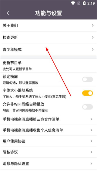 3、在功能与设置界面,找到并点击青少年模式选项,进入青少年模式设置页面。